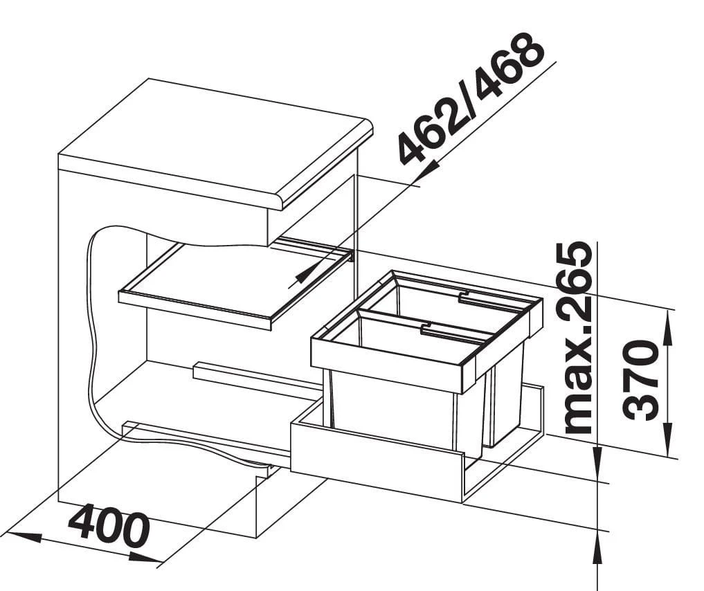 - Wysokość montażowa 355 mm nad dnem szuflady, wysokość montażowa bez pokrywy systemowej 325 mm nad dnem szuflady, głębokość montażowa 400 mm (wymiary wewnętrzne szuflady).
