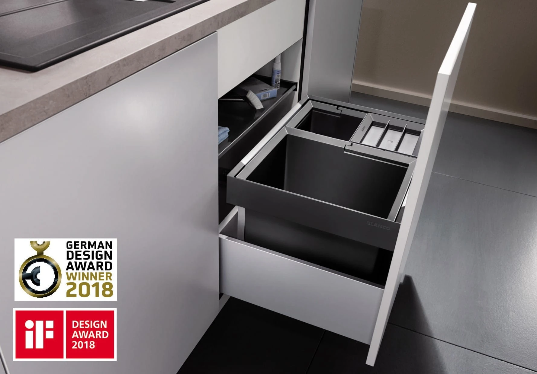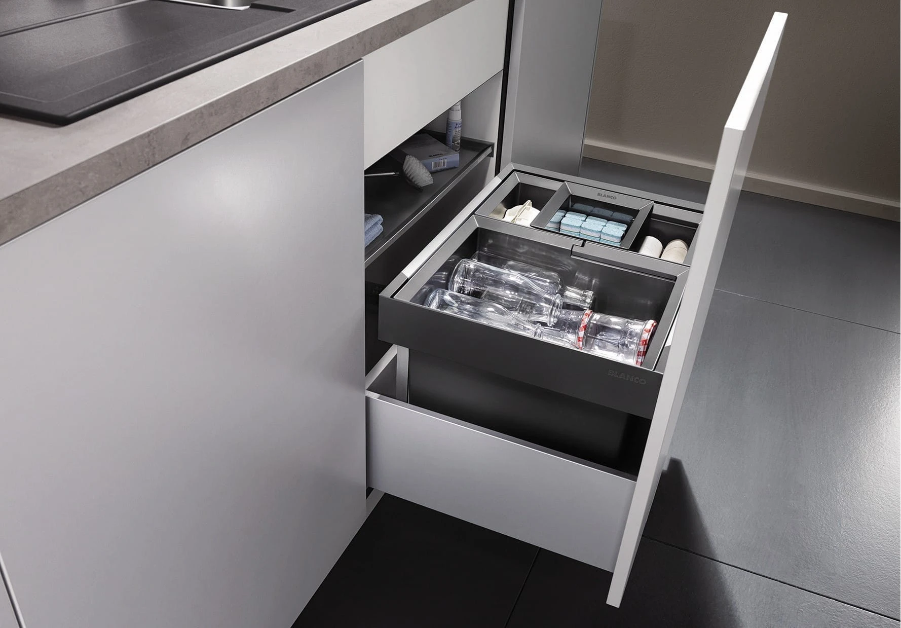Selektor odpadów BLANCO FLEXON II 50/2 umożliwia idealne dopasowanie go do indywidualnych potrzeb: istnieje możliwość wyboru rozmiaru koszy oraz ich ustawienia w szafce/szufladzie.