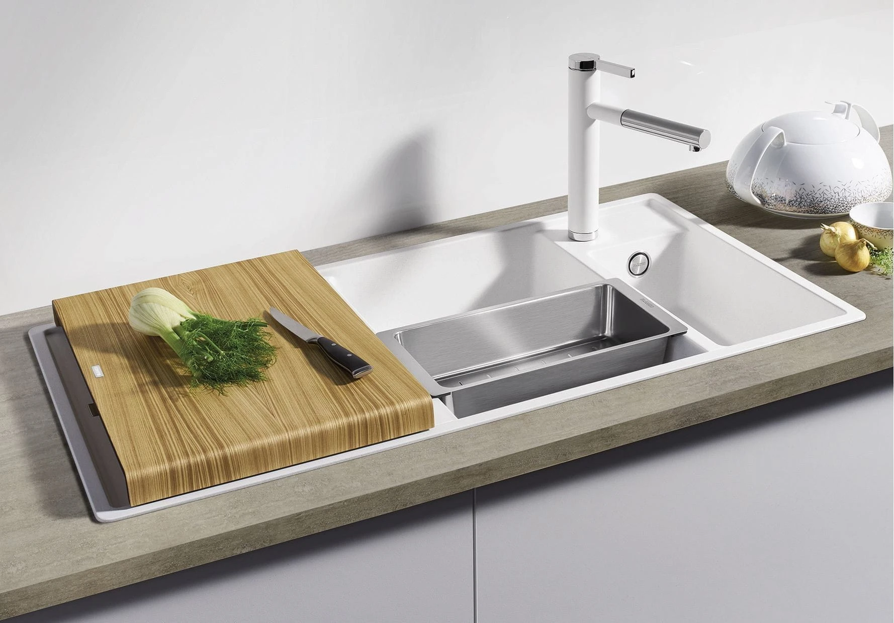 deska do krojenia z bezpiecznego szkła, wielofunkcyjna odsączarka ze stali szlachetnej, armatura przelewowo-odpływowa zapewniająca więcej miejsca w szafce, 2 x korek z sitkiem 3 ½'’ InFino ze sterowaniem korkiem automatycznym (pokrętło) do komory głównej