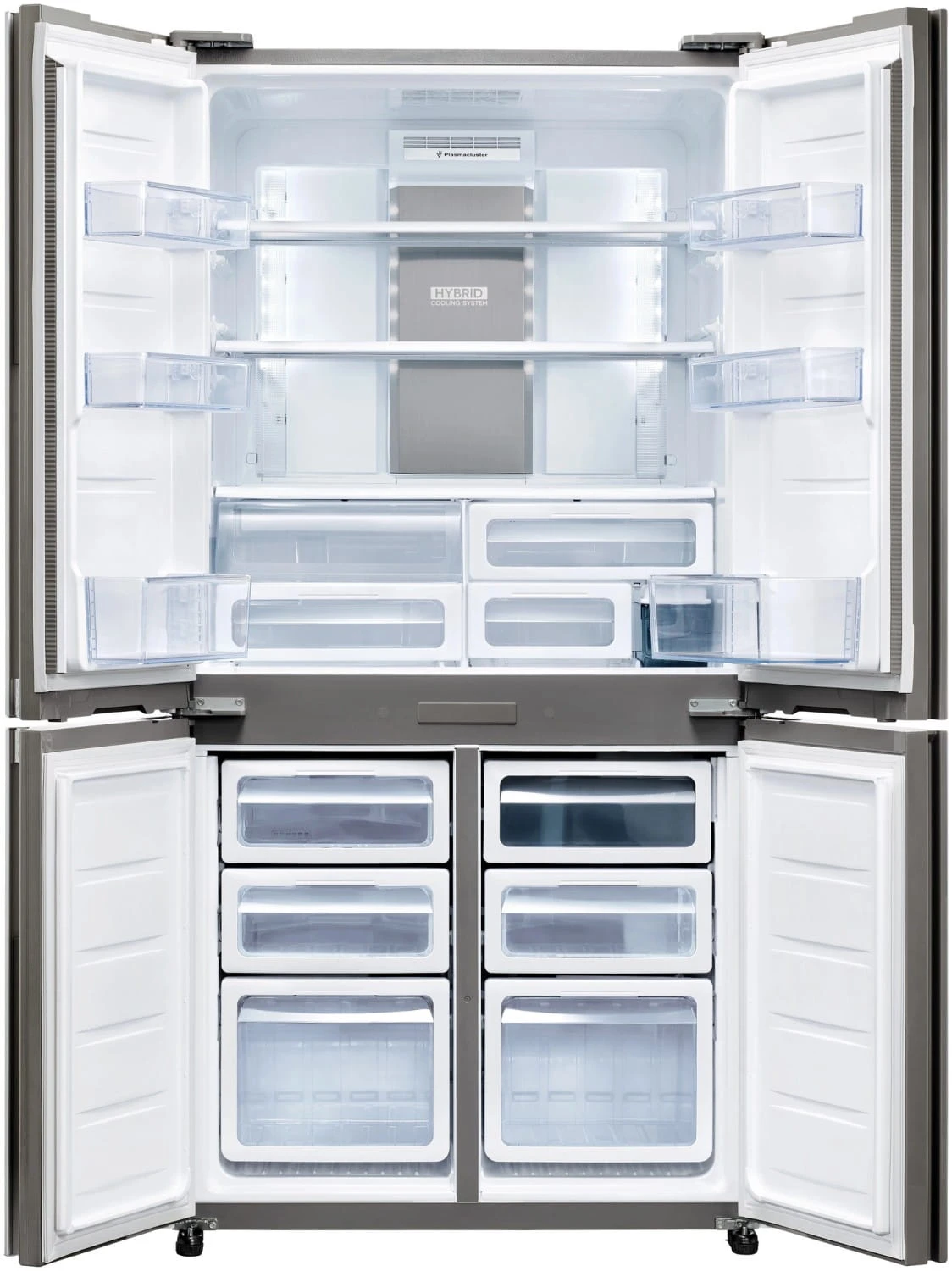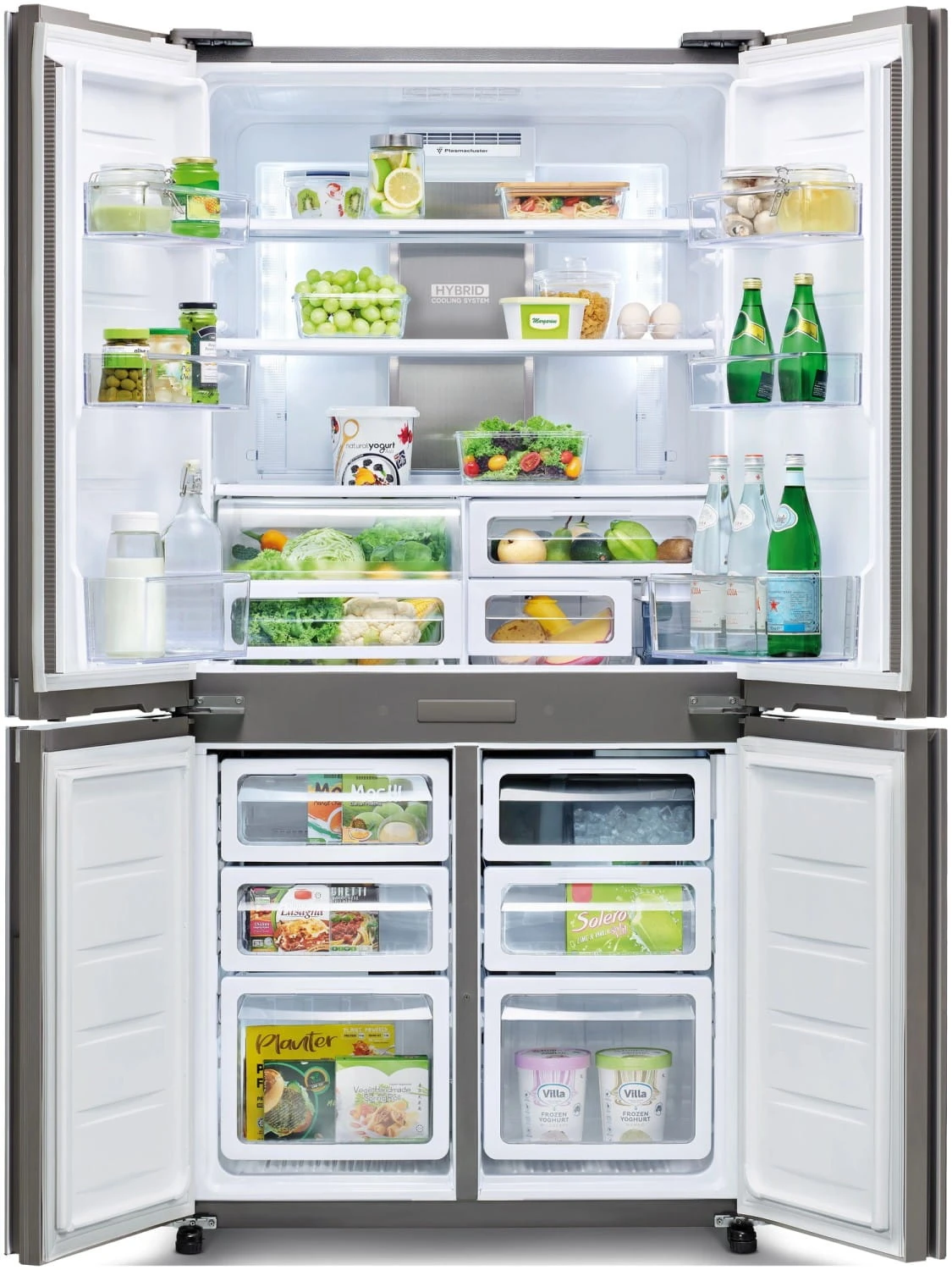 Technologia Plasmacluster neutralizuje bakterie, pleśń i nieprzyjemne zapachy, zapewniając higieniczne warunki przechowywania produktów. Czterodrzwiowa konstrukcja minimalizuje utratę chłodu podczas otwierania, a specjalnie zaprojektowane balkoniki umożliwiają skuteczne chłodzenie także produktów na drzwiach.