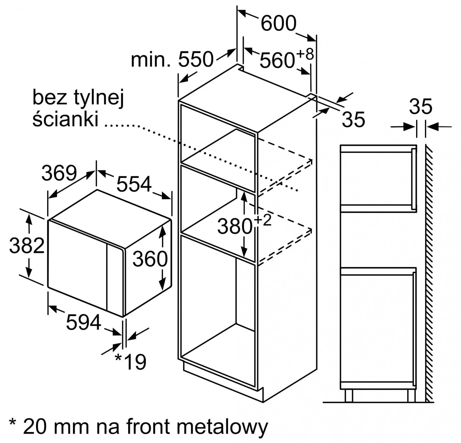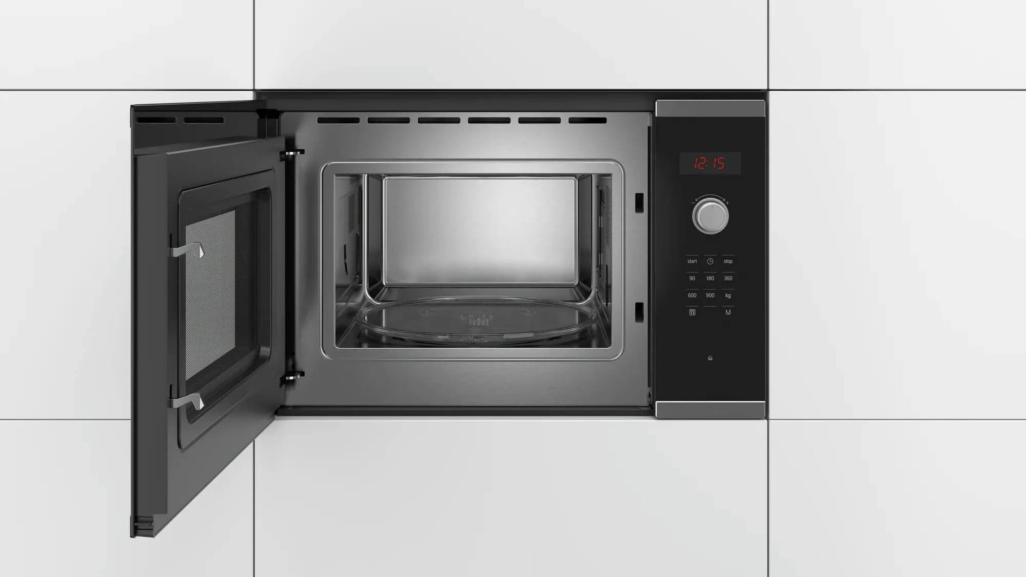 Mikrofalowa kuchenka przeznaczona do zabudowy, o pojemności 25 l, mocy 900 W, z automatyką wagową, 5 poziomami mocy, 7 programami automatycznymi, oświetleniem LED oraz z zegarem elektronicznym.