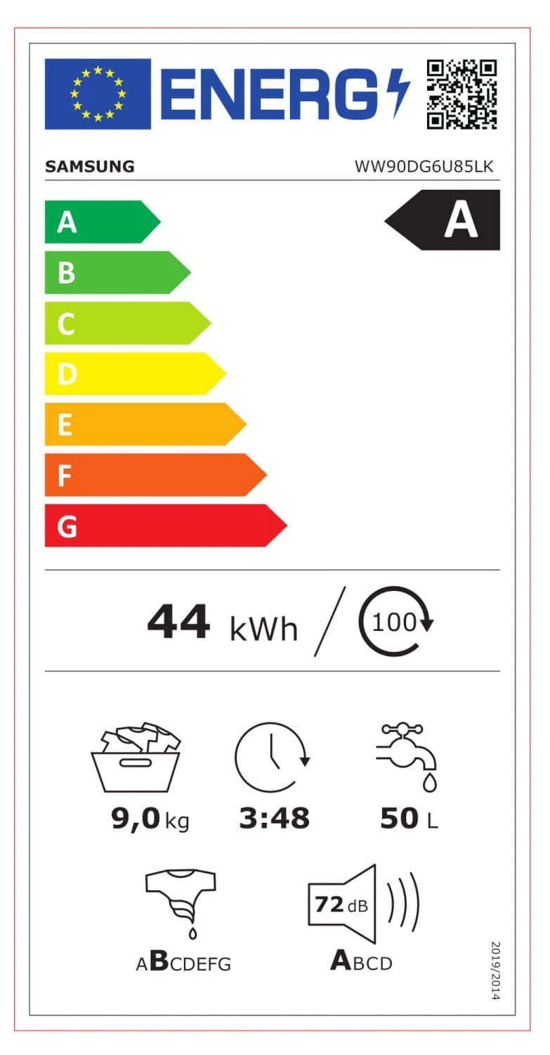 Pralka SAMSUNG WW90DG6U85LKU4 o głębokości 55 cm, pojemności znamionowej 9 kg, z maksymalną szybkością wirowania 1400 obr/min, w klasie energetycznej A. Pralka posiada zabezpieczenie przed dziećmi oraz opcję czyszczenia bębna. Zużycie energii: 44 kWh/100 cykli. Poziom hałasu w fazie wirowania 72 dB.