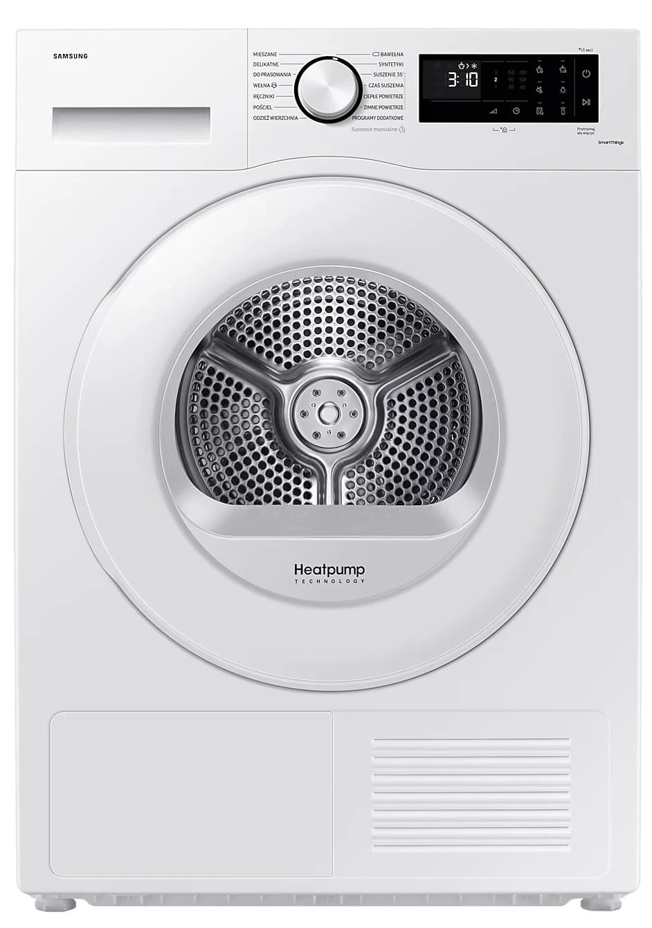 Suszarka kondensacyjna (z pompą ciepła) SAMSUNG DV80CGC0B0TE o pojemności znamionowej 8 kg oraz głębokości 60 cm, w klasie energetycznej A++. Zużycie energii 235 kWh/rok. Zabezpieczenie przed dziećmi. Poziom hałasu 65 dB.