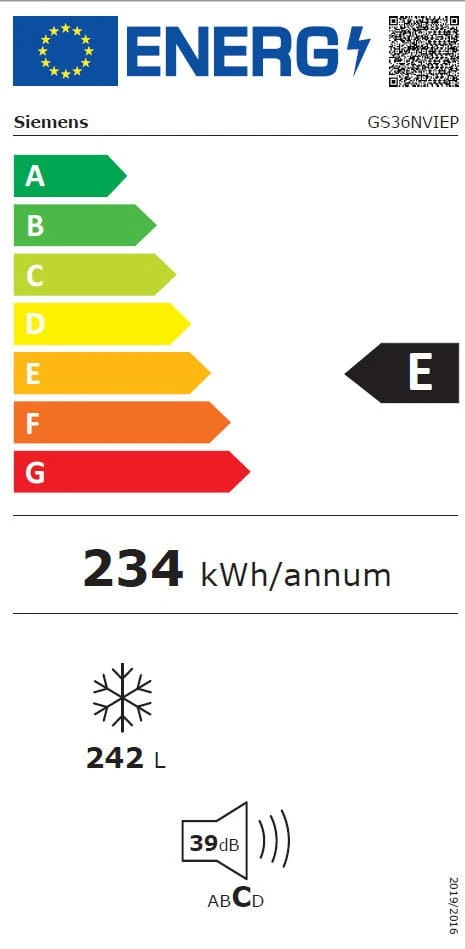 Zamrażarka szafowa SIEMENS GS36NVIEP Wolnostojąca o szerokości 60 cm, pojemności całkowitej netto 242 l, w klasie efektywności energetycznej E. Roczne zużycie energii - 234 kWh/rok, rozmrażanie No-Frost, zdolność zamrażania 18 kg/24h, czas wzrostu temperatury 9 h. Ilość szuflad/klapek - 4. Funkcja szybkiego zamrażania.