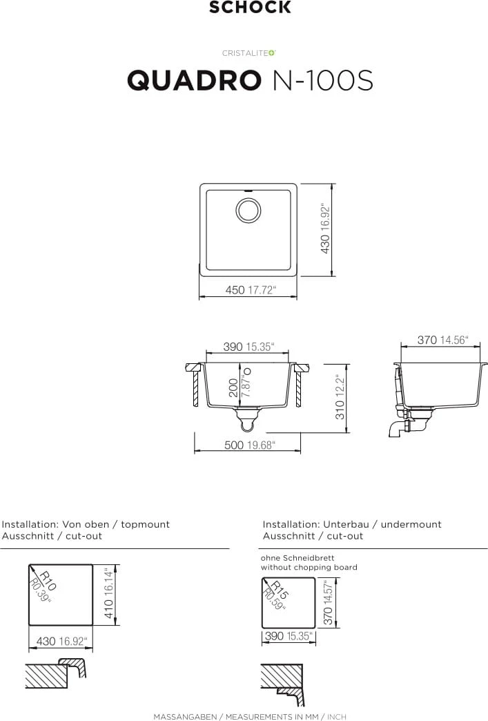 Zlewozmywak 1-komorowy o wymiarach 550 x 430 mm. Zlewozmywak Cristalite+ SCHOCK Quadro N-100 Alpina QUADRO-N100ALPA przeznaczony jest do montażu w szafkach o szerokości 600 mm. Wymiary komory 490 x 430 x 200 mm. Kolor: Alpina.